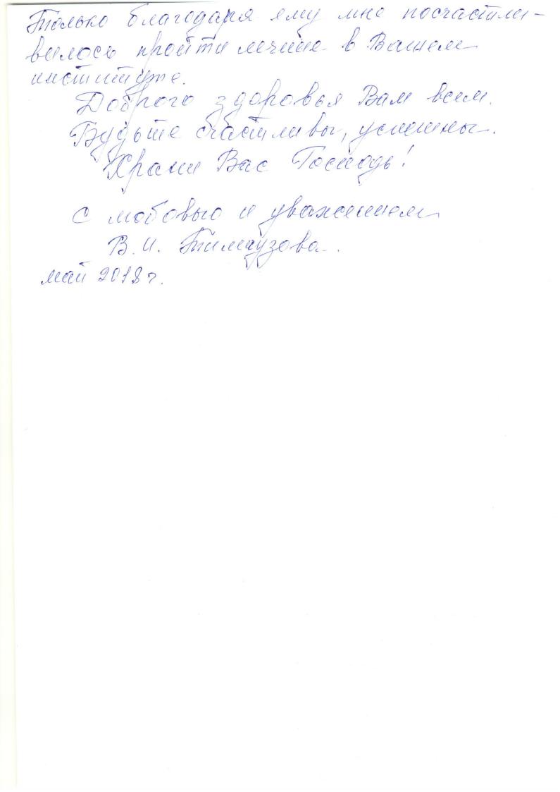 Выражаем огромную благодарность нейрохирургам Минееву Владимиру Петровичу и Катышеву Сергею Андреевичу, которые успешно провели сложную операцию на шейном отделе позвоночника Власовой Т.В. и подарили надежду на возвращение к нормальной жизни, пусть и не сразу (диагноз был очень серьезный-ДДЗП шейного отдела, миелопатия, тетрапарез, стеноз позв.канала, патологический кифоз ШОП, сколиоз.). Были получены консультации нескольких нейрохирургов, в т.ч. в НИИ Вредена, и никто не гарантировал однозначно положительный результат операции, даже был риск полной парализации. Сейчас прошло всего 12 дней после операции, но уже очевидна положительная динамика, когда мы приехали в НИПИ им.В.М. Бехтерева, мама не могла пройти и трех шагов самостоятельно, не могла самостоятельно есть (держать ложку в руке). Сейчас уже многое начала делать сама (пока в основном левой рукой, но и правой уже кое-что получается), и стала передвигаться намного увереннее. Намного улучшилось общее состояние и координация. Надеемся на полное выздоровление со временем.