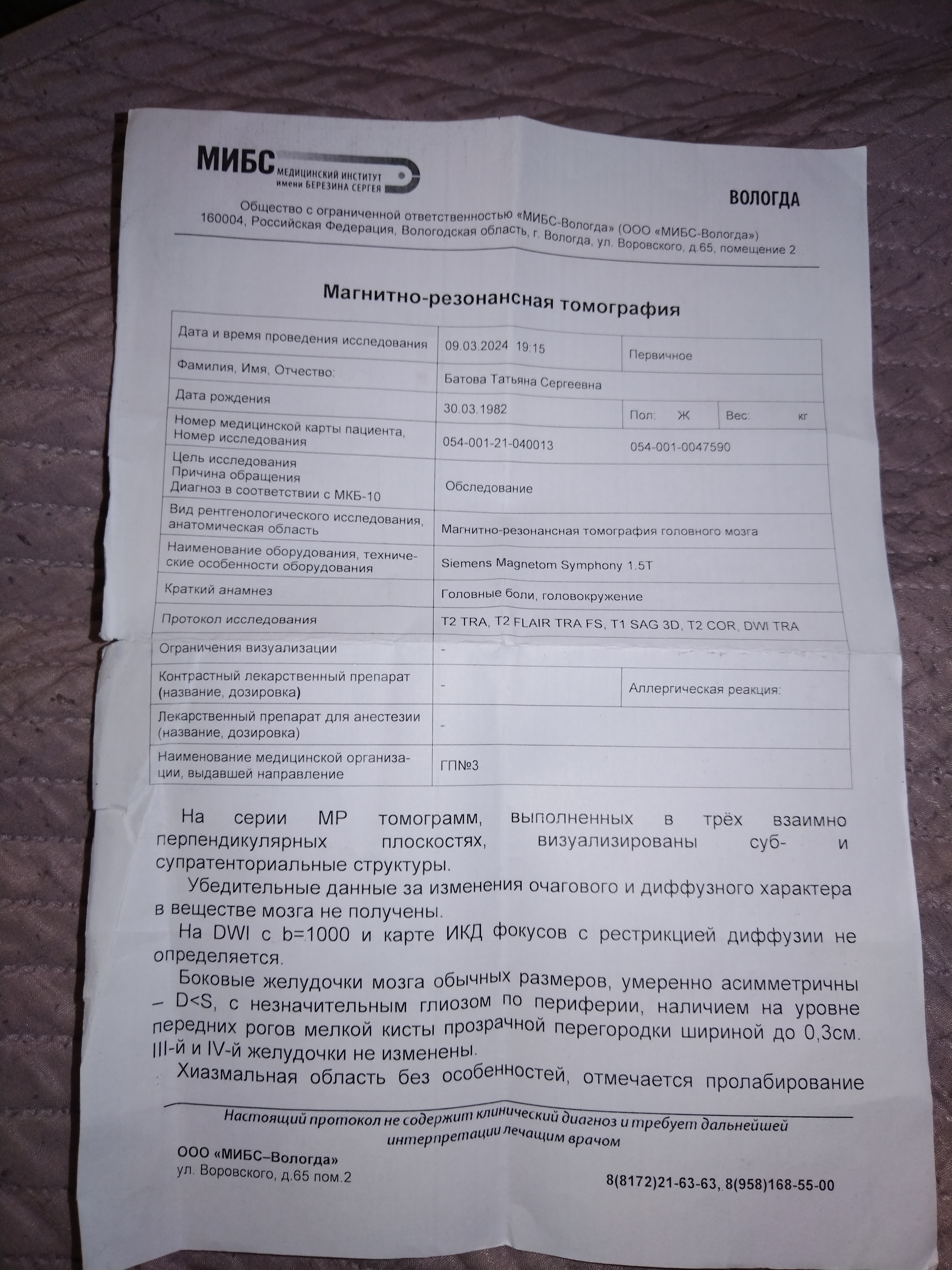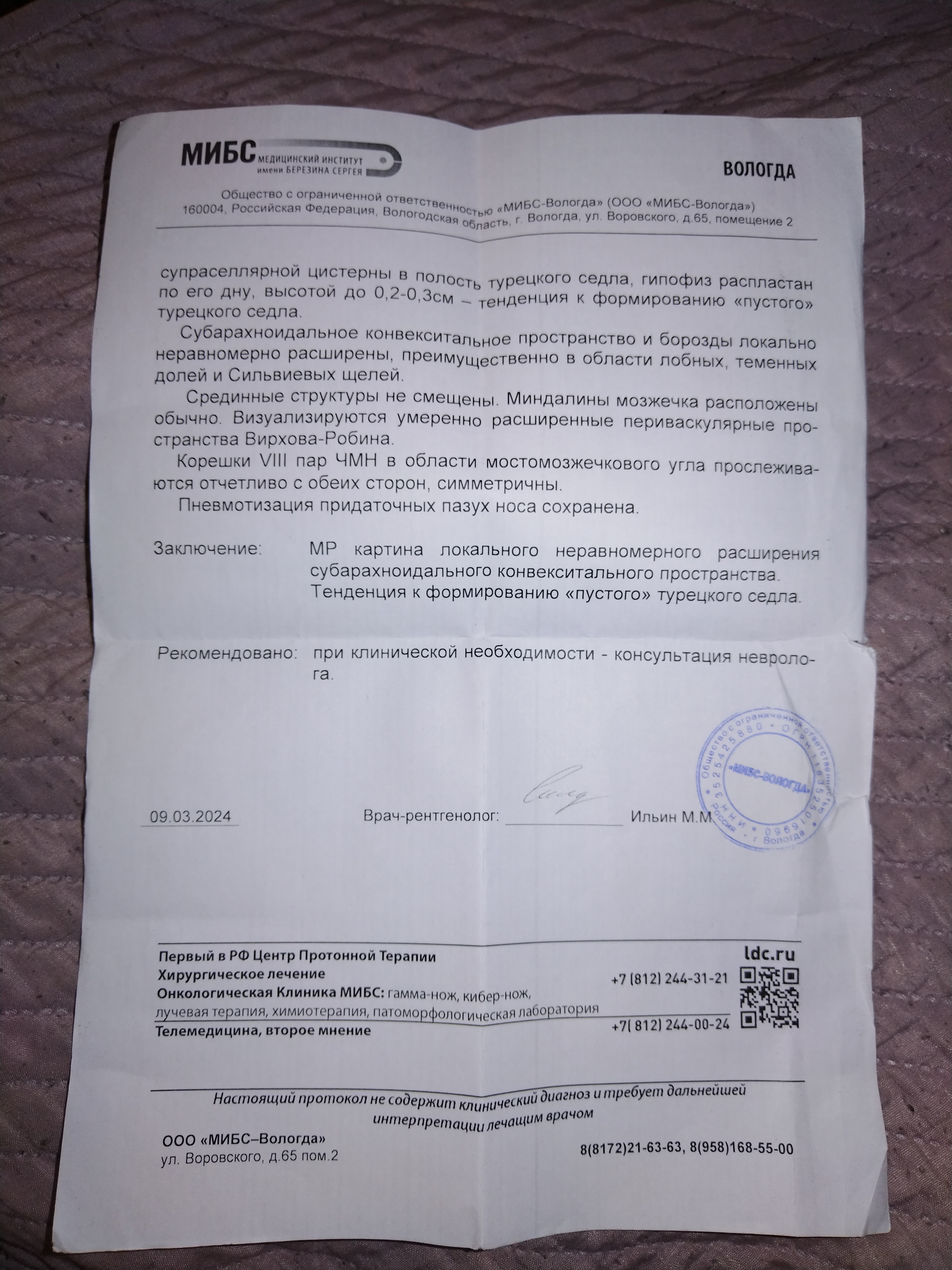 Вам необходимо обратиться к тому врачу, который назначил Вам это обследование. В Центре существует платная услуга - "Второе мнение". Вы можете записаться на консультацию к нашему специалисту и принести на прием свои исследования.
