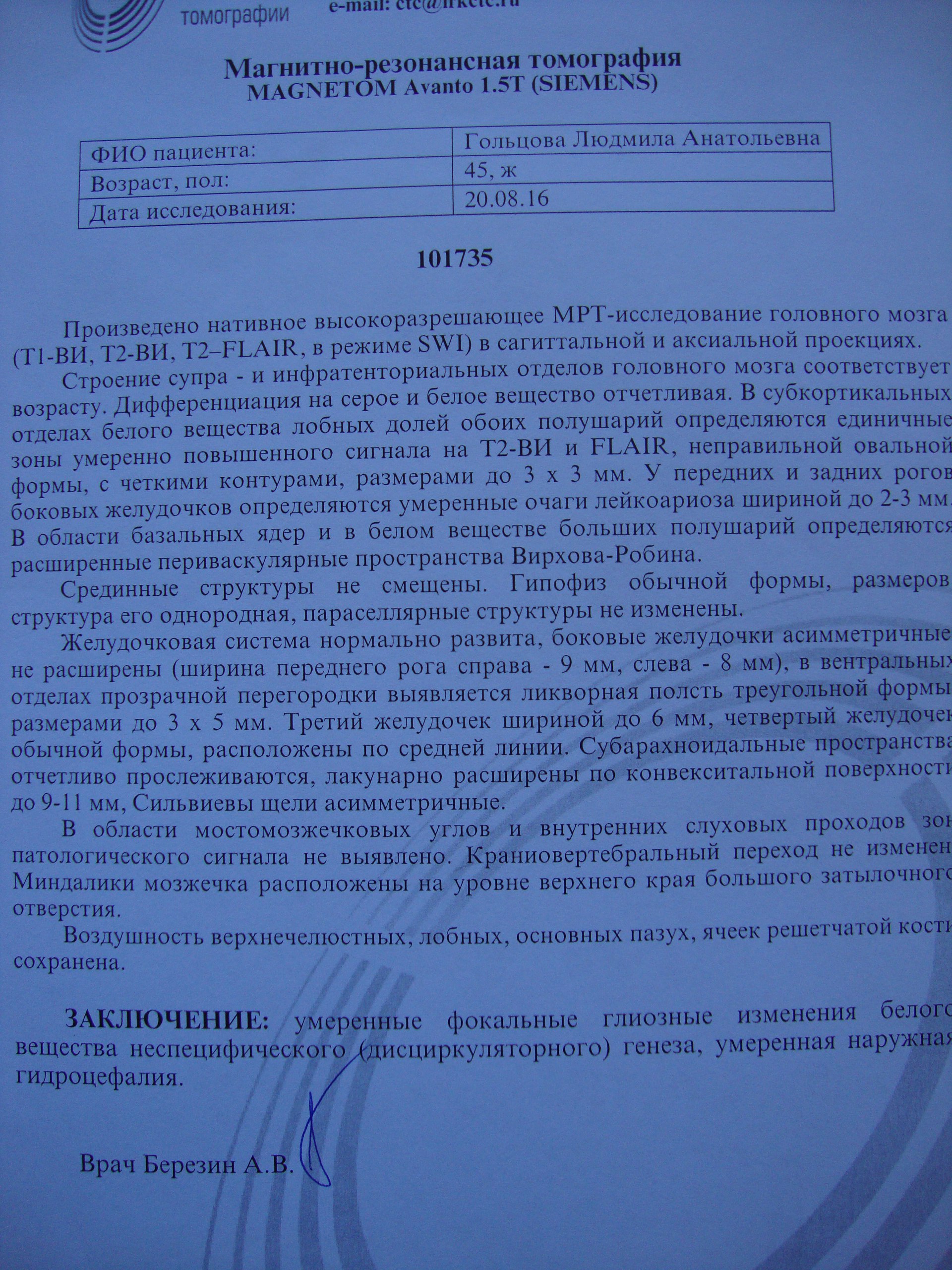 Добрый день. Мне 45 лет. Живу в Иркутской области. Профессия моя мастер маникюра. У меня такая проблема. 4 июня 2016 года у меня началось головокружение со скачками давления, давление само по себе резко повышалось и резко понижалось. Обратилась в местную поликлинику к терапевту. Сдала общий анализ крови, анализ на сахар и анализ мочи. Все анализы показали норму. Анализ щитовидной железы и УЗИ щитовидной железы тоже в норме. Терапевт назначил лечение на 3 недели : миксидол 1т. 2 раза в день, глицин 1 т. 3 раза в день, пустырник на ночь. когда закончила пить препараты через пару дней состояние резко ухудшилось, это было 24 июня 2016 года. Направили к неврологу, и назначили флюраграфию шейного отдела. Заключение флюраграфии: Высота тел и межпозвоночных дисков не нарушено. Поставили диагноз - Цервикалдия, Вертибровертиброгенная цервикокранниалгия с вестибулопатиями, обострение. Легко выраженные вестибуло-координаторные нарушения, рефликторно мышечно-танический синдром. Назначили эл/форез с NaBr 3% по Щербакову на шейно-воротниковую зону, уколы пирацетам 20% 10 уколов в/в, комбилепен 2,0 в/м 10 уколов, бетагистин 16 мг 1т. 3 раза в день 30 дней. Очень плохо перенесла это лечение, т.к. состояние только ухудшалось ( непроходящее головокружение, давящие головные боли на виски и затылок, иногда в теменной области). 18 июля меня положили в стационар (выписка из истории болезни №08653, прилагаю) После проведенниго лечение улудшения нет вообще. Добавился гул, шум в левом ухе. так же сделали УЗИ сосудов шеи (результат обследования прилагаю, дата обследования 09.08.2016 "Дуплексное сканирование брахиоцефальных артерий "внечерепной отдел" ", это же обследование прошла 20.08.2016 в гор. Иркутске результаты обледований разные, так же в гор. Иркутске прошла МРТ головного мозга, заключени прилагаю. Поставили диагноз дизонтогенетическая энцефалопатия, астено вегитативный синдром, вестибулопатия под вопросом. Рекомендовано лечение кортексин 10 мг в/м 10 уколов, бетасерк 24 мг 2 рада в день 3 недели, мексидол 2 т. 2 раза в день 3 недели, целебрекс 200 мг 2 раза в день 10 дней, тенотен 1 т. 2 раза в день в течении месяца. начала пока принимать бетасерк и мексидол. В настоящее время ощущаю сильное непроходящее головокружение, давящие головные боли и просто боли виквов, затылке и иногда во всей голове, гул в левом ухе, заложенность в ушах, плохой сон, постоянное чувсво беспокойство и страха, артериальное давление не постоянное или целый день пониженное 110/70 пульс 80-90 ударов, а иногда давление скачет весь день от 110/70 до 130/90 пульс до 110 ударов в минуту. Иногда появляются боли в области сердца, сердечные приливы. С 24 июня 2016 года я не работаю, а постоянно лежу, самостоятельно никуда не выхожу и не остаюсь одна. Что мне сделать если и это лечение не поможет? Какие обследования мне еще нужно пройти? Помогите пожалуйста, я не живу, а просто существую.