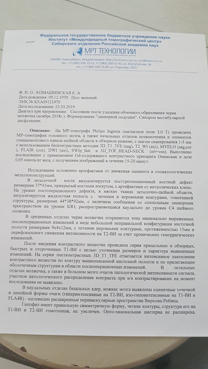 Добрый день! я 1970 г.р. 23 ноября 2018 года мне удалили доброкачественную опухоль червя мозжечка. на контрольном мрт 23 января2019г восстановление шло нормально, но образовалась ликворная подушка, что , по мнению врача, тоже являлось обыденным послеоперационным осложнением. 14-17 февраля я осуществила перелет. 21 февраля утром я внезапно потеряла сознание,меня тошнило, рвало, в глазах все безумно качалось, отвезли в неврологическую реанимацию,капали цитофлавины, потом перевели в палату, где я еще провела неделю. контрольное мрт показало небольшое образование лобной доли неизвестной этиологии. выписали меня практически без диагноза, сказав, чтобы я сама попыталась найти грамотных врачей. 25 марта было сделано 3хтесловое мрт, не показавшее образования. после этого я провела консультации с нейрогирургом и невропатологом. жалобы - сильное головокружение в горизонтальном положении. очень низкое ад по утрам, учащенный пульс, слабость. кровь в норме оказалась. у нейрогирурга претензий нет, невропатолог сообщила, что у меня сильный мозжечковый нистагм, посоветовала делать лфк с поворотами и принимать цераксон. сказала, что на сегодняшний день современная медицина не имеет других методов лечения и реабилитации. может быть вы, люди, прфессионильно занимающиеся мозгом, имеете в своем арсенале средства диагностики и лечения моего заболевания? или подсказать центры за рубежом. мрт все есть в цифре. могу прислать, по необходимости.
