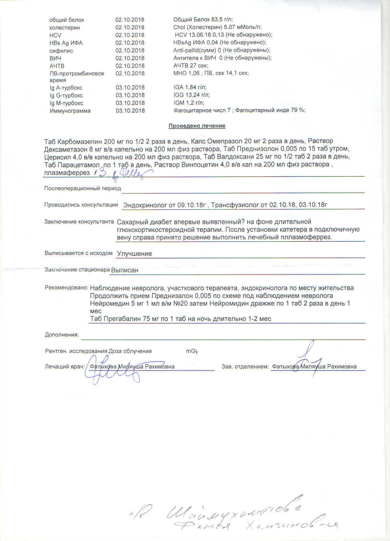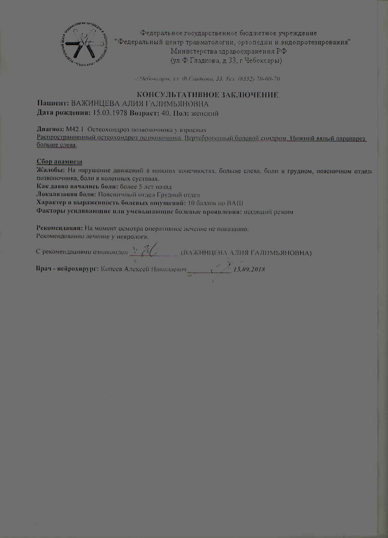 Здравствуйте! На основании представленных Вами мед сведений невозможно оценить степень и причину неврологических нарушений о определить дальнейшую тактику лечения. Желательно провести до обследование в виде мрт пораженных участков позвоночника, электронейромиографию всех конечностей. Со своей стороны можем предложить госпитализацию начиная с 09.01.19. тел для записи на госпитализацию +79219003976.