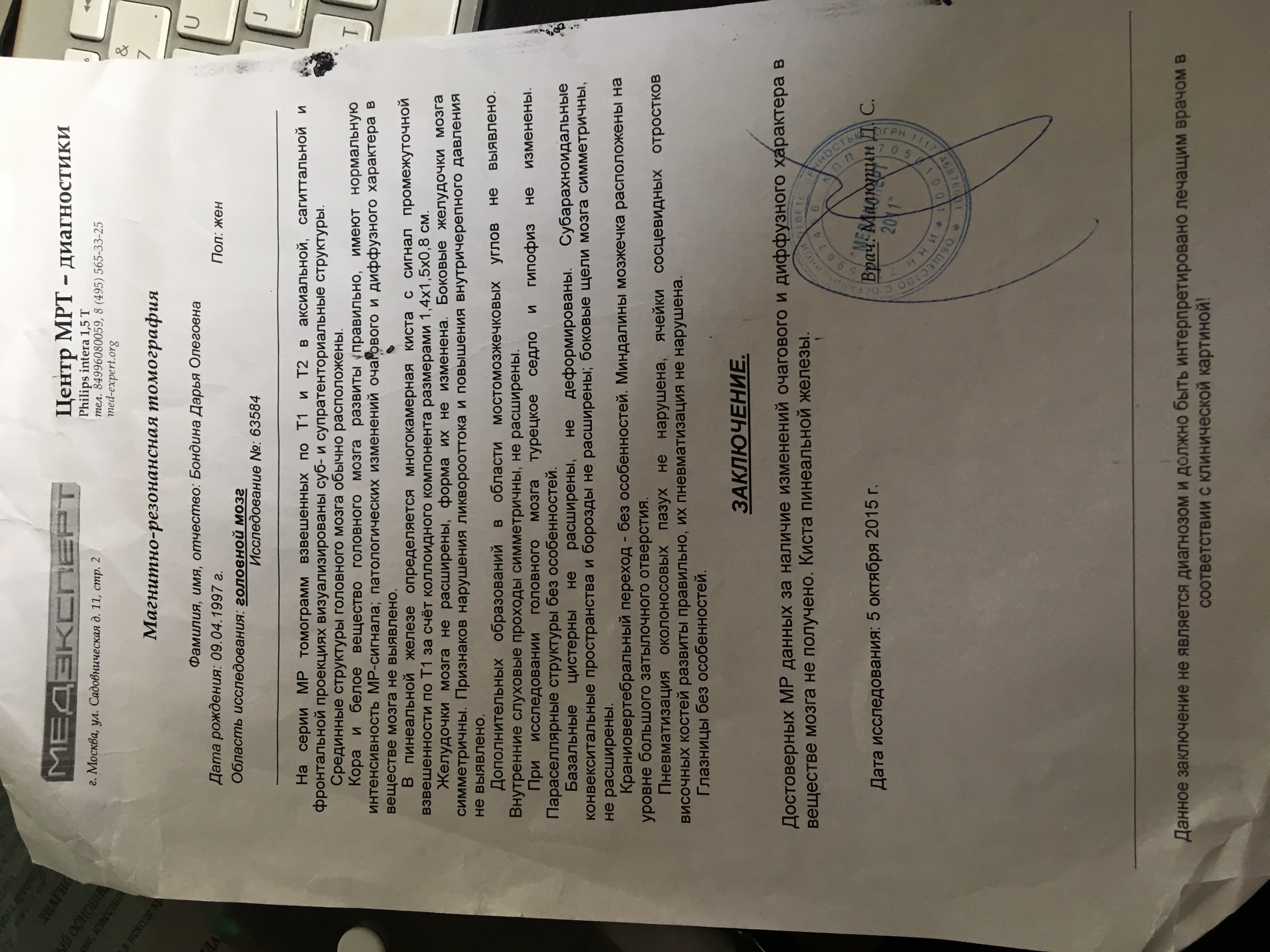 Здравствуйте! В 2015 году была обнаружена киста пинеальной железы. Случайно на мрт, отправляли по поводу панических атак и невроза! Сейчас в 2019 от нервов или нет начался шум в левом ухе, боюсь что это могла разрастись киста! Скажите возможно ли это? Боюсь снова делать мрт! Или это вряд ли от этого? В 2015 консультировались у нейрохирурга, его ничего не насторожило, сказал не обращать на неё внимания