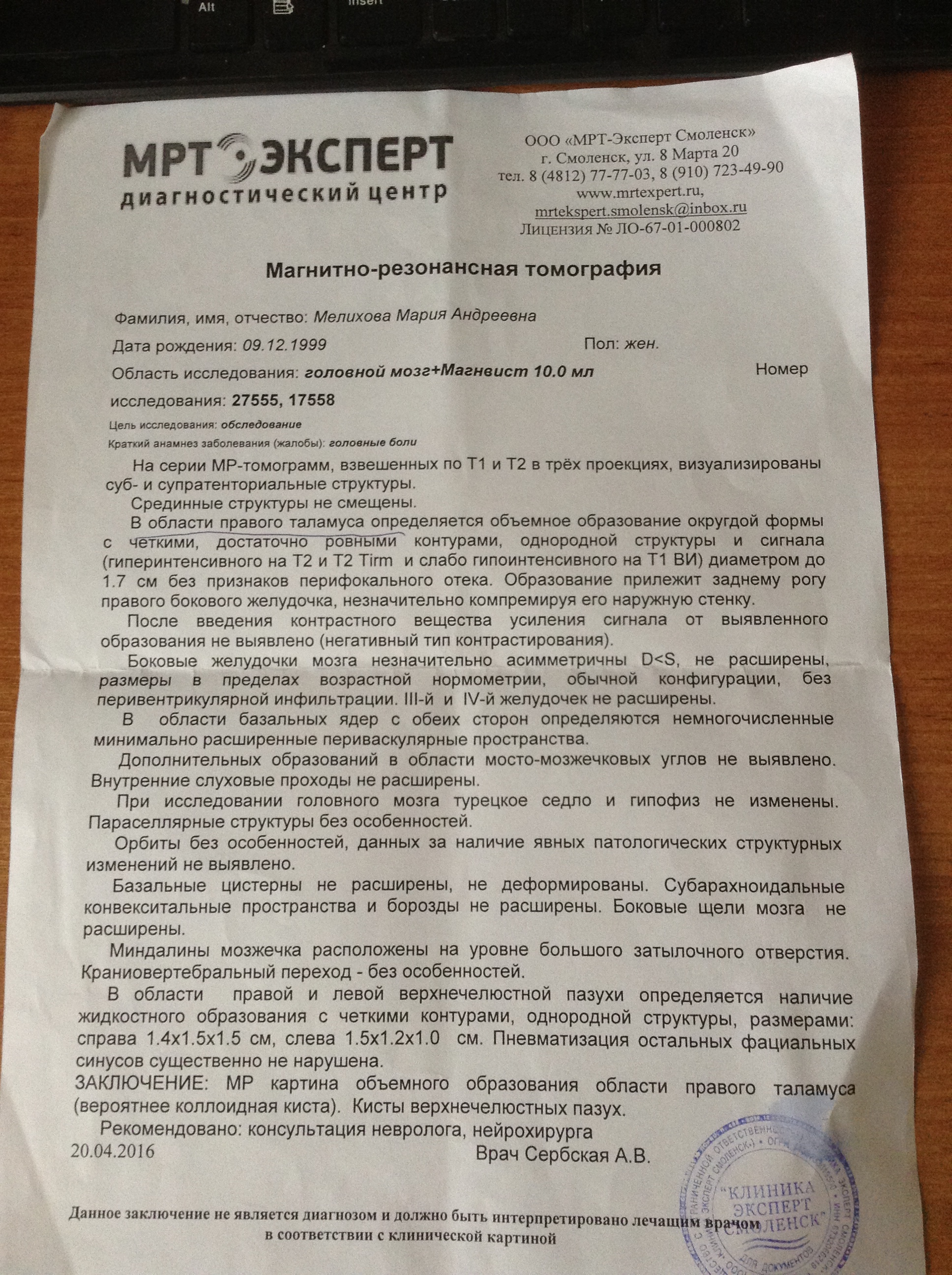 Re: Коллоидная киста правого таламуса у девочки 16 лет
