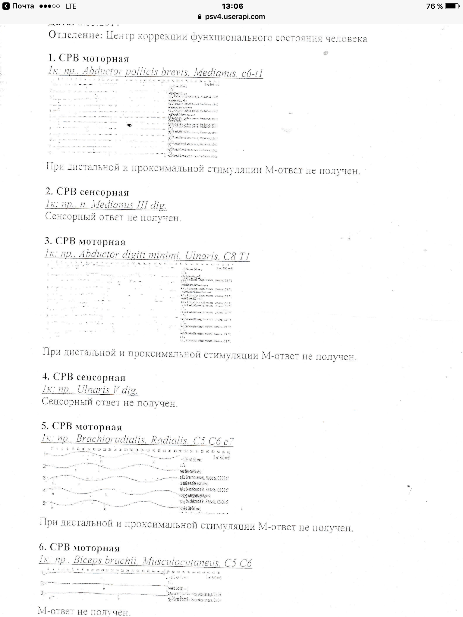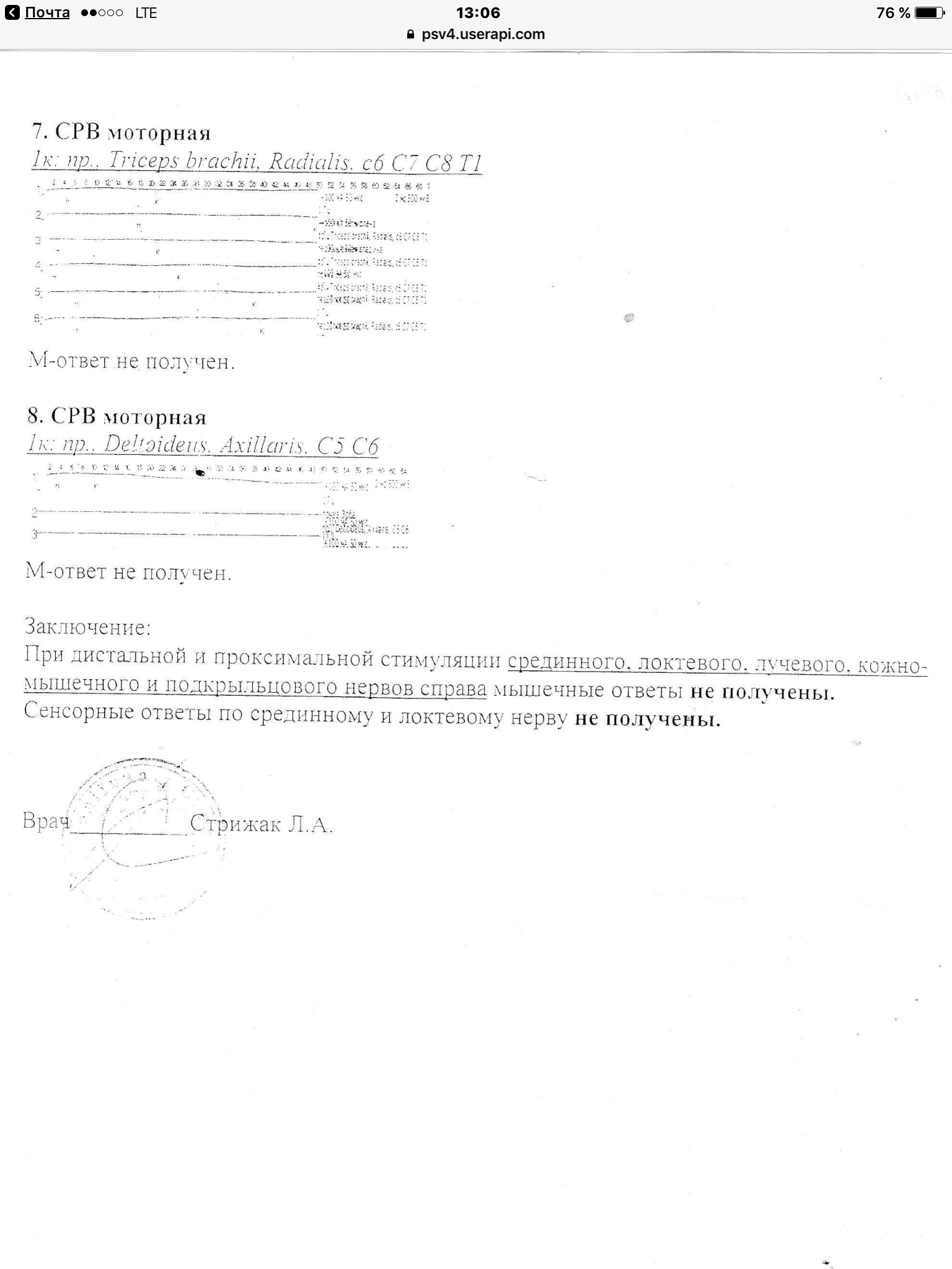 ЭНМГ от 2011 г Заключение: придистальной и проксимальный стимуляции срединного, локтевого, лучевого, кожномышечного и подкрыльцового нервов справа мышечные ответы не получены. Сенсорные ответы по срединному и локтевому нерву не получены.