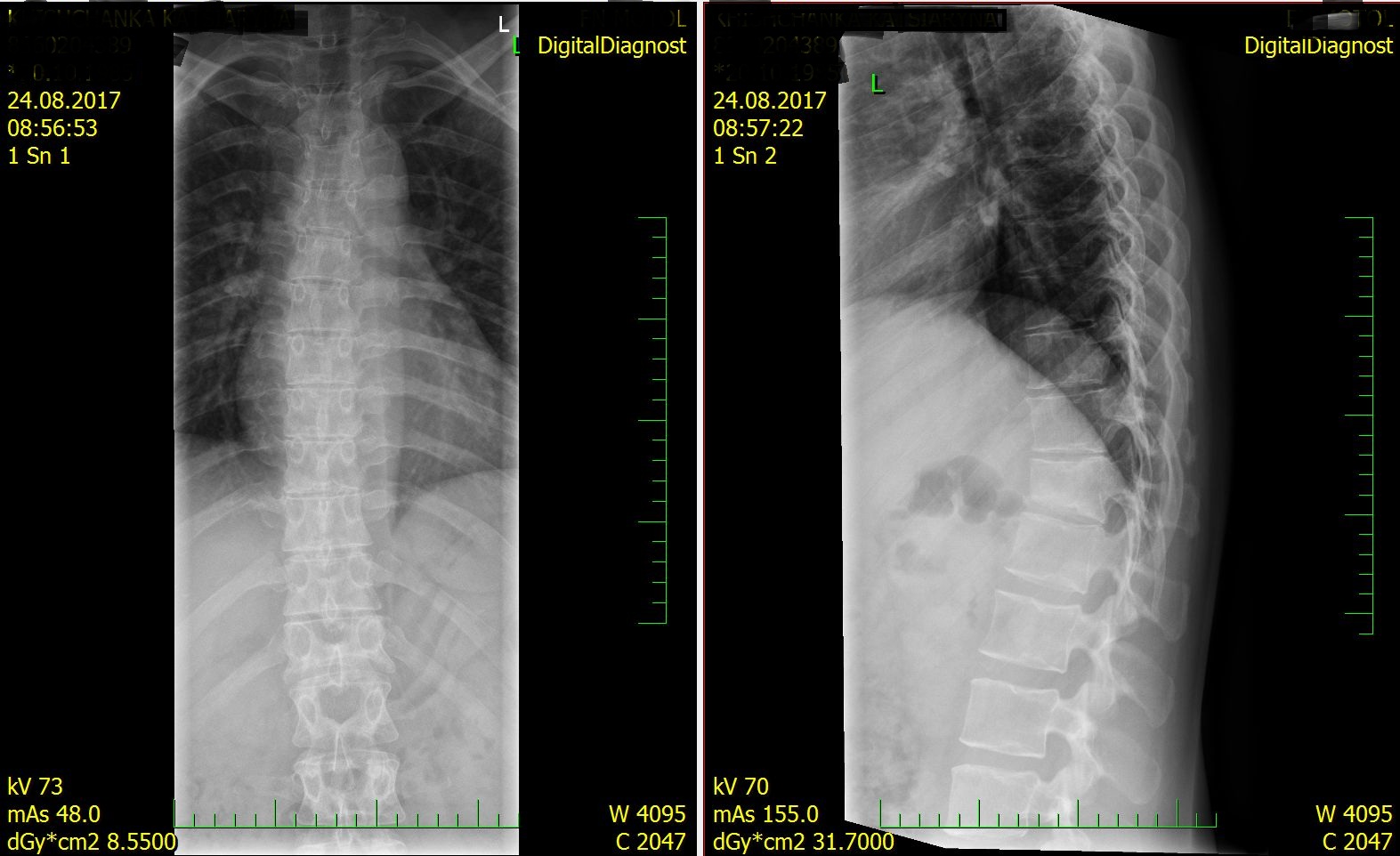 клиновидная деформация позвонка ( компрессионный перелом 1 ст) есть. Чтобы оценивать динамику -нужно сравнивать снимки первые и последующие(Вы прислали только последние). Показания к оперативному лечению компрессионного перелома основывается и на снимках и на осмотре человека(который заочно не делается). В целом, если говорить не о коррекции сколиоза и массивной коррекционной операции в виде транспедикулярной фиксации, а о компрессионном переломе- то его ведение простое. Обычный рентген в динамике, чтобы оценить степень консолидации перелома и отсутствие дальнейшего снижения высоты тела позвонка с приемом медикаментов для коррекции боли-это консервативное лечение. При этом носится грудо-поясничный реклинатор в вертикальном положении. Либо плановое (с согласия пациента) малоинвазивное оперативное лечение - вертебропластика.