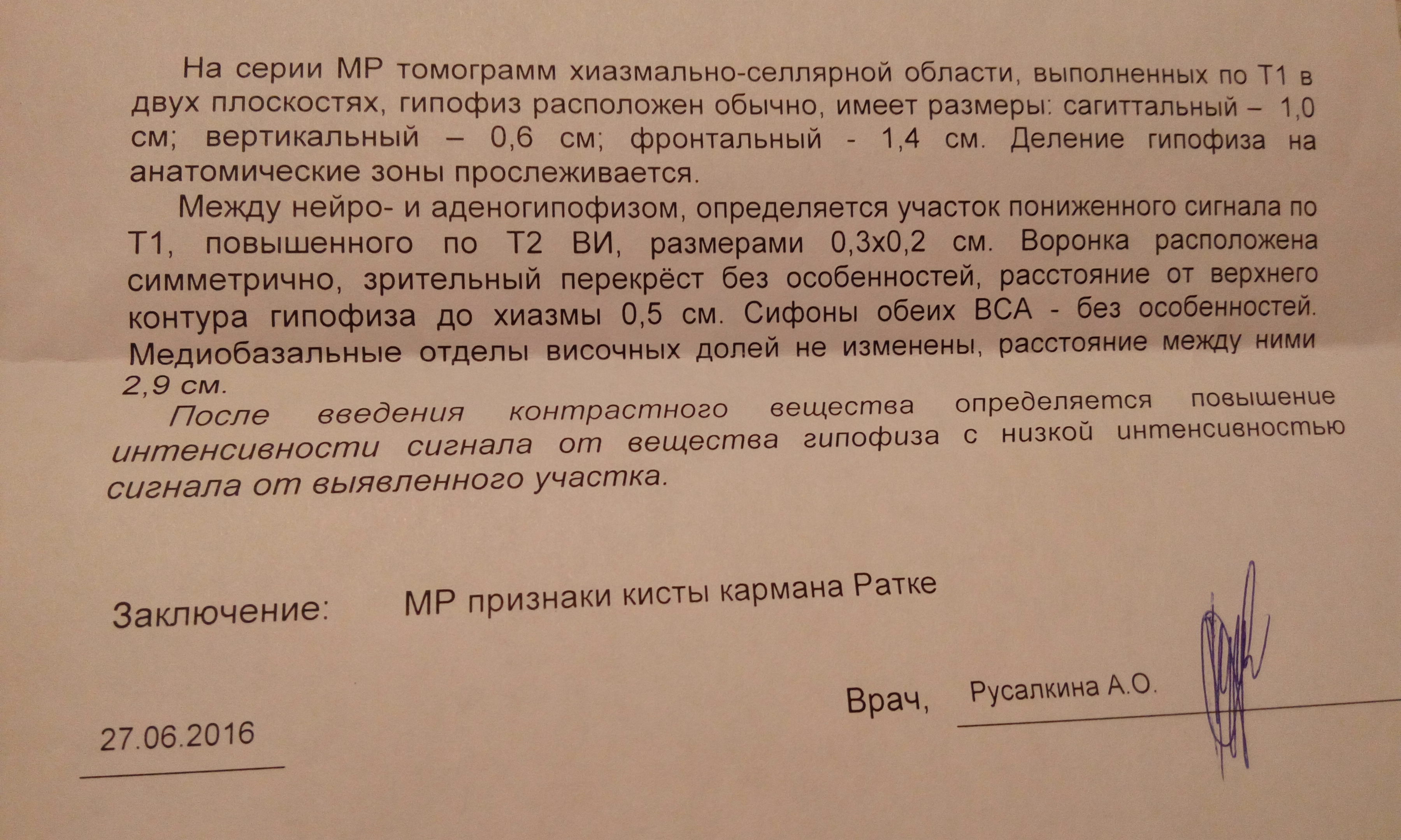 [img]Здравствуйте. Заключение МРТ во вложении. (есть ещё снимки на диске). Беспокоит ,что на МРТ 2008 и 2015 г. эту китсу не находили. Хотя по словам врача рентгенолога крайний раз была применена расширенная программа. Обследуюсь из-за аденомы гипофиза. Пролактин повышен, но хорошо корректируется достинексом. Зрение стало даже лучше в последнее время. Головные боли редко, но бывают (как у всех).