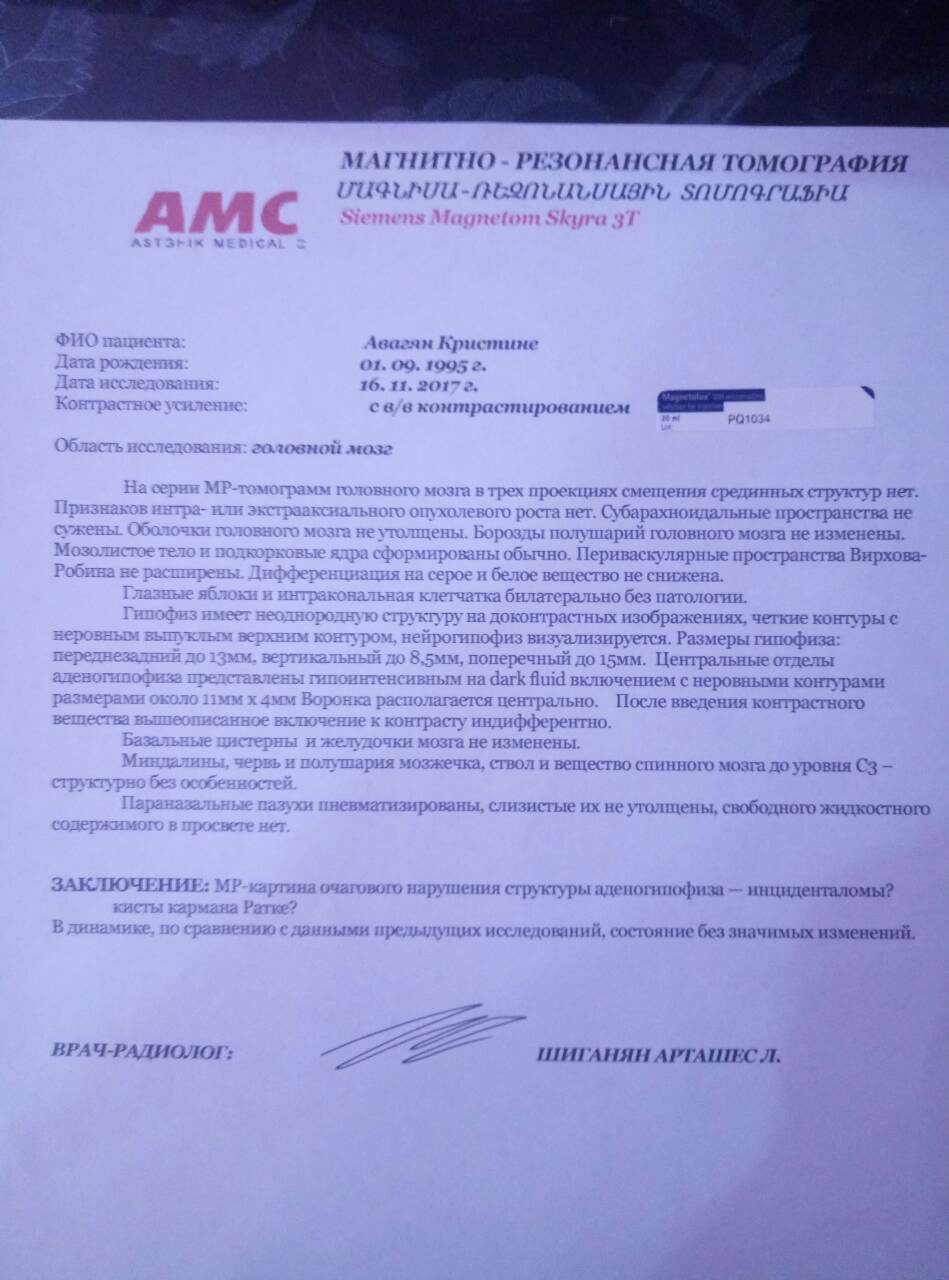 yulia_otzi_12 писал(а):Здравствуйте! Пришла с жалобами на головные боли к неврологу, меня направили на мрт. Сделала мрт 29.09.2015 году дали следующее заключение. Заключение: картина наиболее соответствует кисте кармана Ратке с повышенным содержанием белка. Рекомендовано консультация эндокринолога и контроль в динамике. ТТГ был 3,23 при норме 3,4мкМЕ/мл. В 2017 планируем с мужем беременность и поэтому я пошла повторно сдавать все анализы в том числе гормоны. Все анализы были в норме кроме тиреотропного гормона (4,61 мкМЕ/мл при норме 0,27-4,2). После этого эндокринолог повторно направила на мрт. Сделала мрт 03.04.2017. Заключение МР признаки кровоизлияния в гипофиз. Рекомендовано консультация эндокринолога, лабораторный и МР контроль. Сдала анализ на пролактин. Пролактин в норме 476 при норме (100-496). Сдавала анализ на пролактин, после того как пропила 2-3 дня L-тироксин по 0,25 мкг 1 раз в день утром натощак. Чувствую я себя хорошо, но бывают головные боли. Подскажите пожалуйста какие дальнейшие действия? Лечится ли данное заболевание? Смогу ли я родить ребенка с данным заболеванием? Заранее большое спасибо!