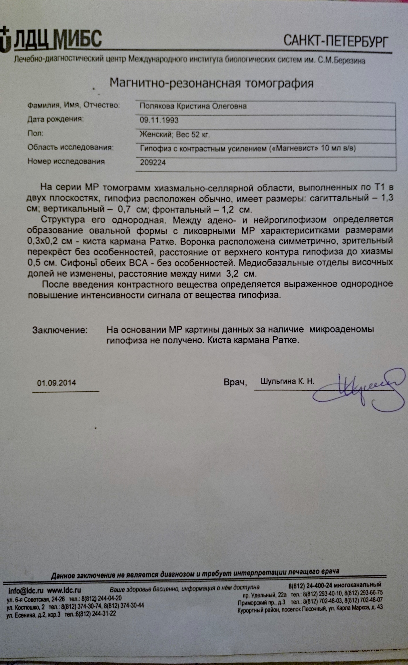 заключение исследования МРТ