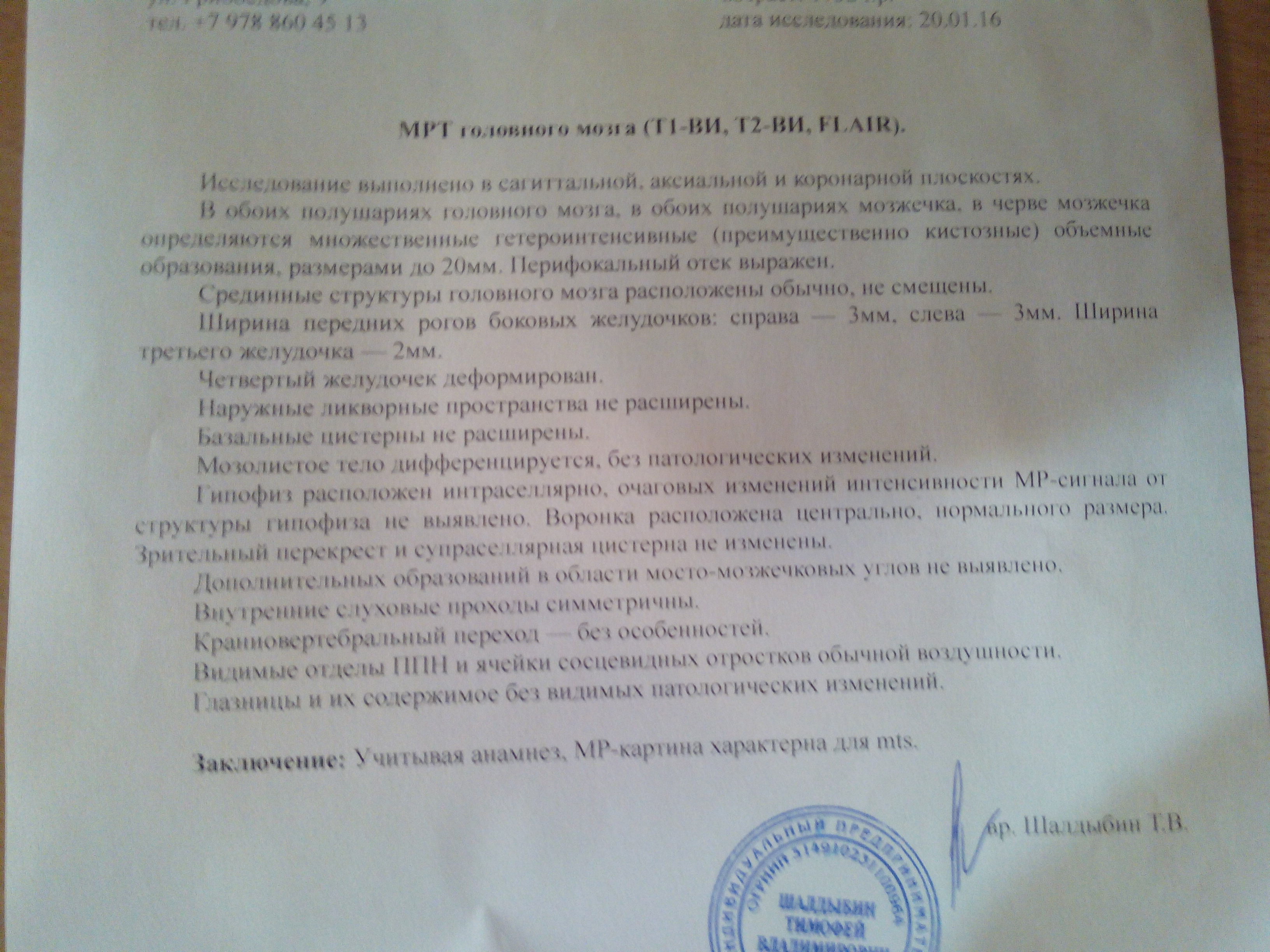 Добрый день! Моя мама в 2013г. перенесла мастэктомию против рака груди. Затем было много сеансов лучевой и химио-терапии. Позже были обнаружены mts в кости и под подозрением плевра легких и печень. Месяц назад она стала жаловаться на боли в голове, провели мрт-исследование, которое показало диффузное поражение оболочек мозга в левой гемисфере с разнокалиберными узлами. Нельзя исключить mts-поражение костей черепа и шейных позвонков. Мелкоочаговая лейкоэнцефалопатия, вероятно, сосудистого генеза. Церебральная атрофия 2-3 ст. "пустое" турецкое седло. Результаты мрт высылаю. После этого исследования ей рекомендовано тотальное облучение головного мозга, но так как врачи оценили ее состояние как слабое, пять дней она принимает Дексаметазон 12 мл в день, затем показывается врачу для последующей лучевой терапии.