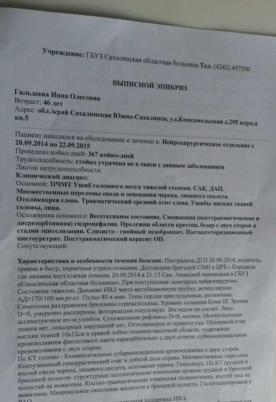 Подруга после ДТП. Срок с 19.09.2014 года, вегетативное состояние. Эпикриз с диагнозом во вложении.
