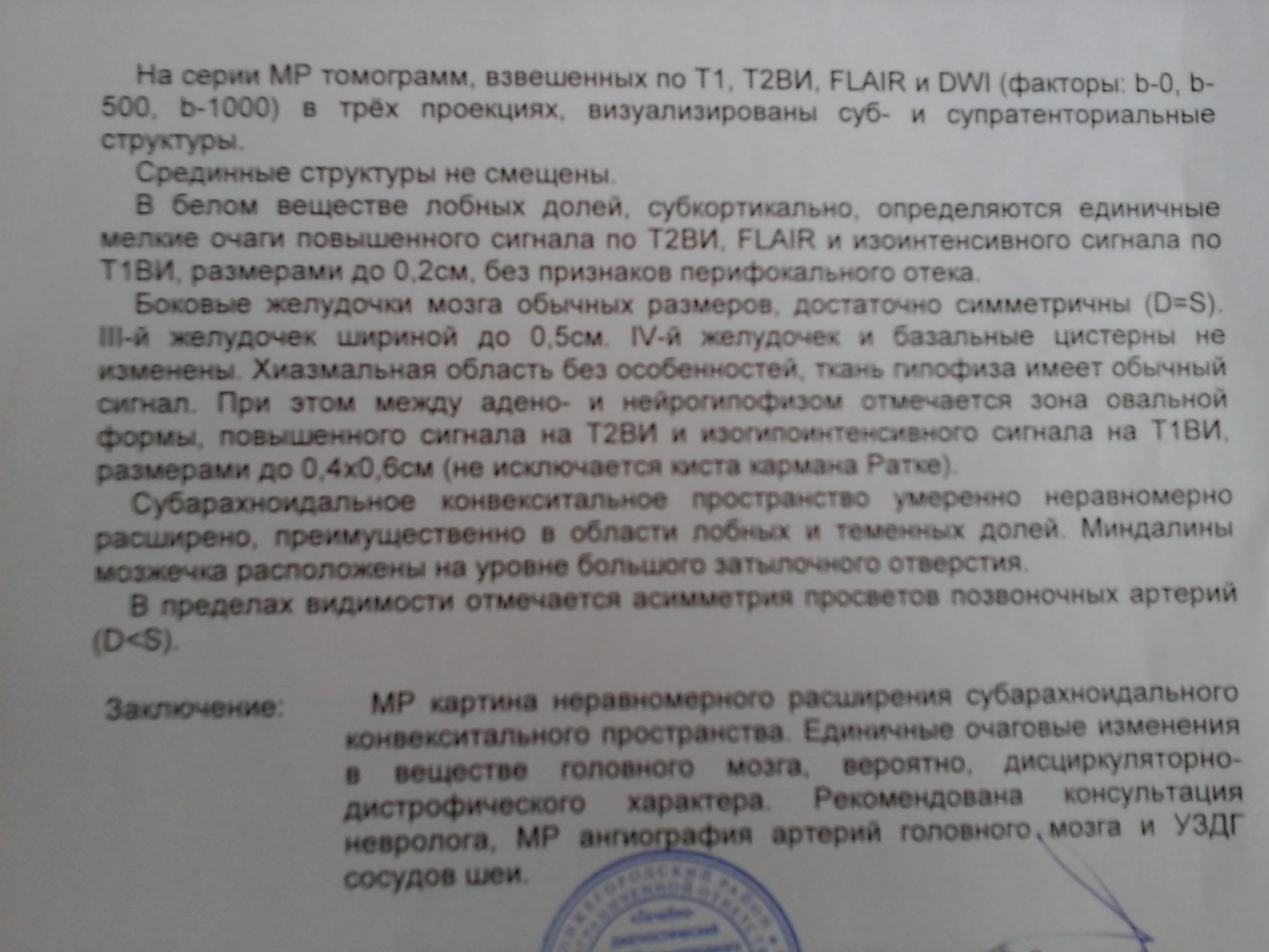 ЗАКЛЮЧЕНИЕ: МР признаки единичных очаговых изменений в больших полушариях, данные соответствуют демиелинизирующему процессу без отрицательной динамики к данным за 2013г. Признаки умеренной наружной гидроцефалии. Признаки пансинусита.